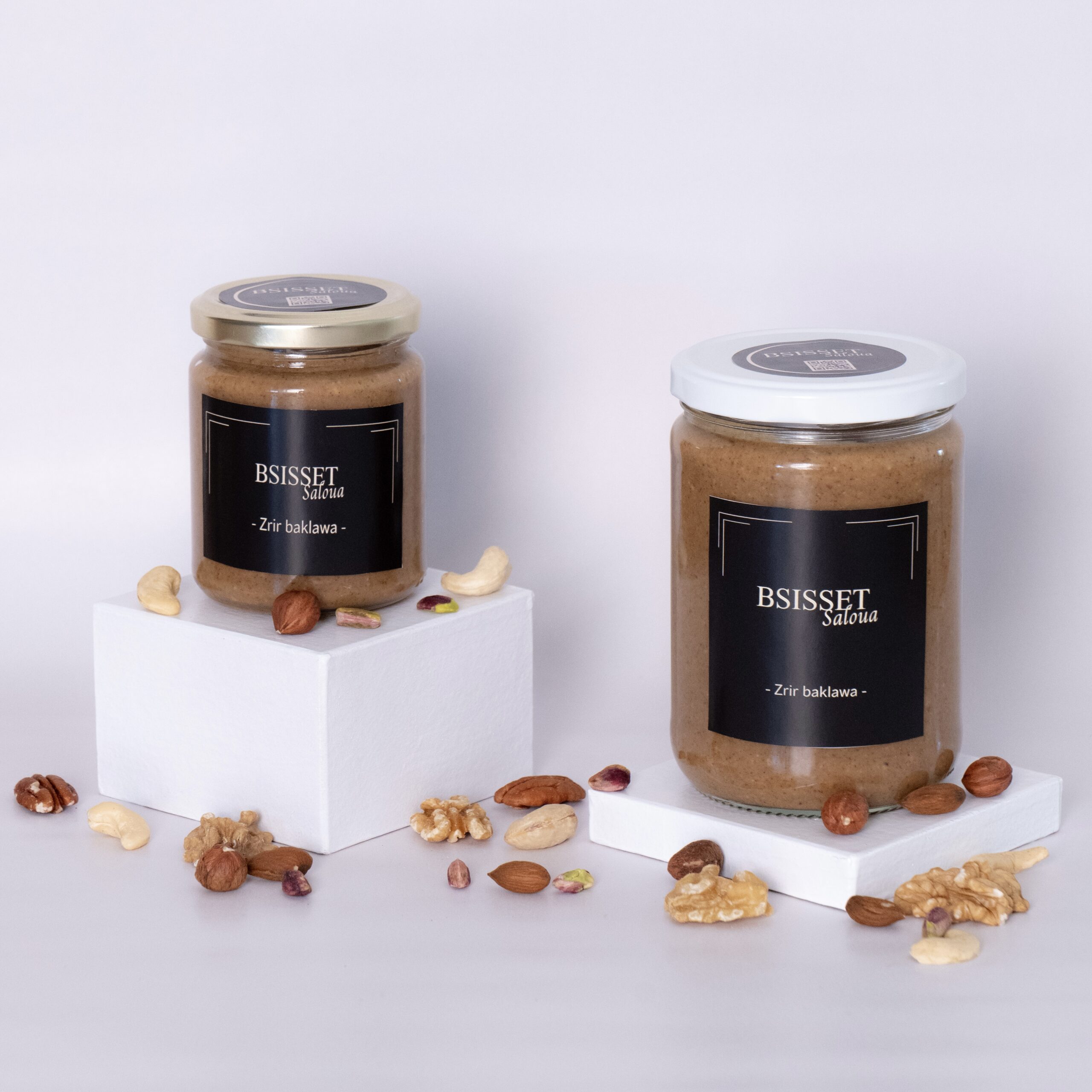 Notre Zrir Baklawa se distingue par la fraîcheur de ses ingrédients : des pistaches croquantes, des noisettes riches, des amandes fondantes, ainsi que des graines de sésame et des noix délicatement torréfiées. Tout cela est enrobé d’un miel de fleurs pur et d’un beurre onctueux, pour une douceur incomparable.